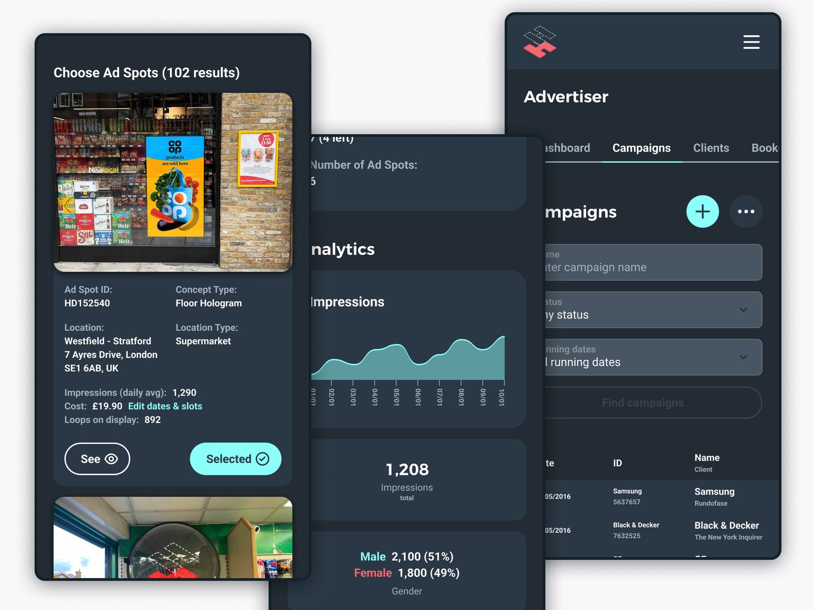 The AI camera data was the platform's core differentiator but also its biggest communication challenge. Attention time, mood reactions, and real-time demographic breakdowns were metrics advertisers had never encountered in an OOH context. I designed the analytics dashboard around the decisions they'd actually need to make — which spots performed, how to compare placements, and what to adjust next time — rather than surfacing raw data and leaving them to interpret it. The goal was to make the AI data feel like a natural extension of how they already thought about campaign performance.